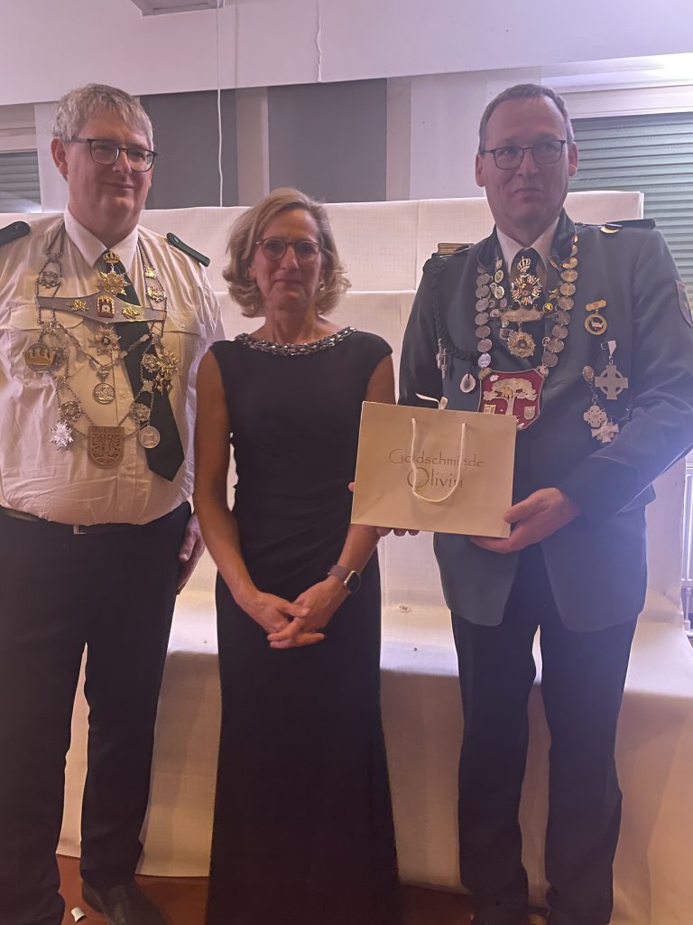 Angeführt von Vogelhauptmann Magnus Mentz, marschierten Norbert Junge und seine Bärbel vor Timo Gladen und seiner Bianca ein, Komplettiert wurde dieser Marsch von Scheibenhauptmann Daniel Fischer. Alle Gäste erhoben sich von ihren Stühlen und erwiesen klatschend den Gastgebern ihre Ehrerbietung.